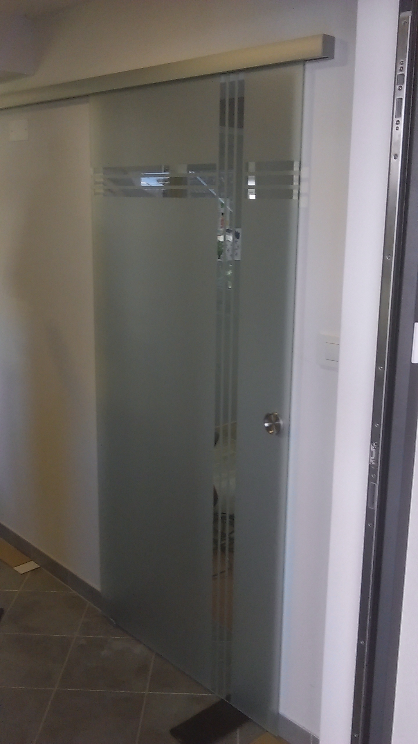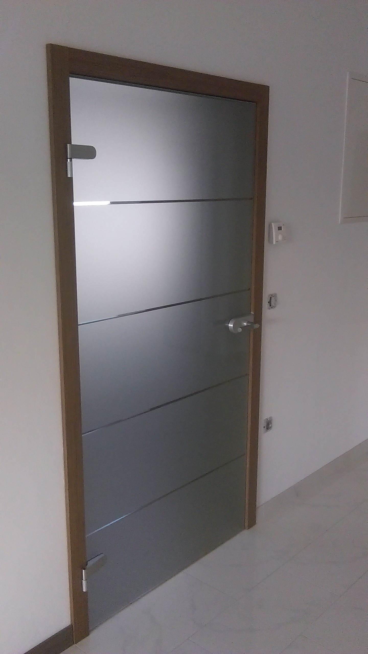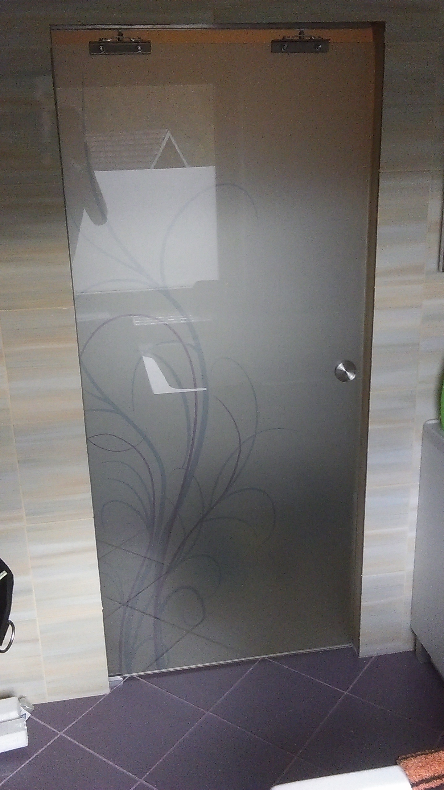 Steklena vrata Izdelujemo vrata vseh dimenzij iz kaljenega 8,8mm ali 10mm stekla. Lahko so prozorna, jedkana ali vzorčna iz fototapete.