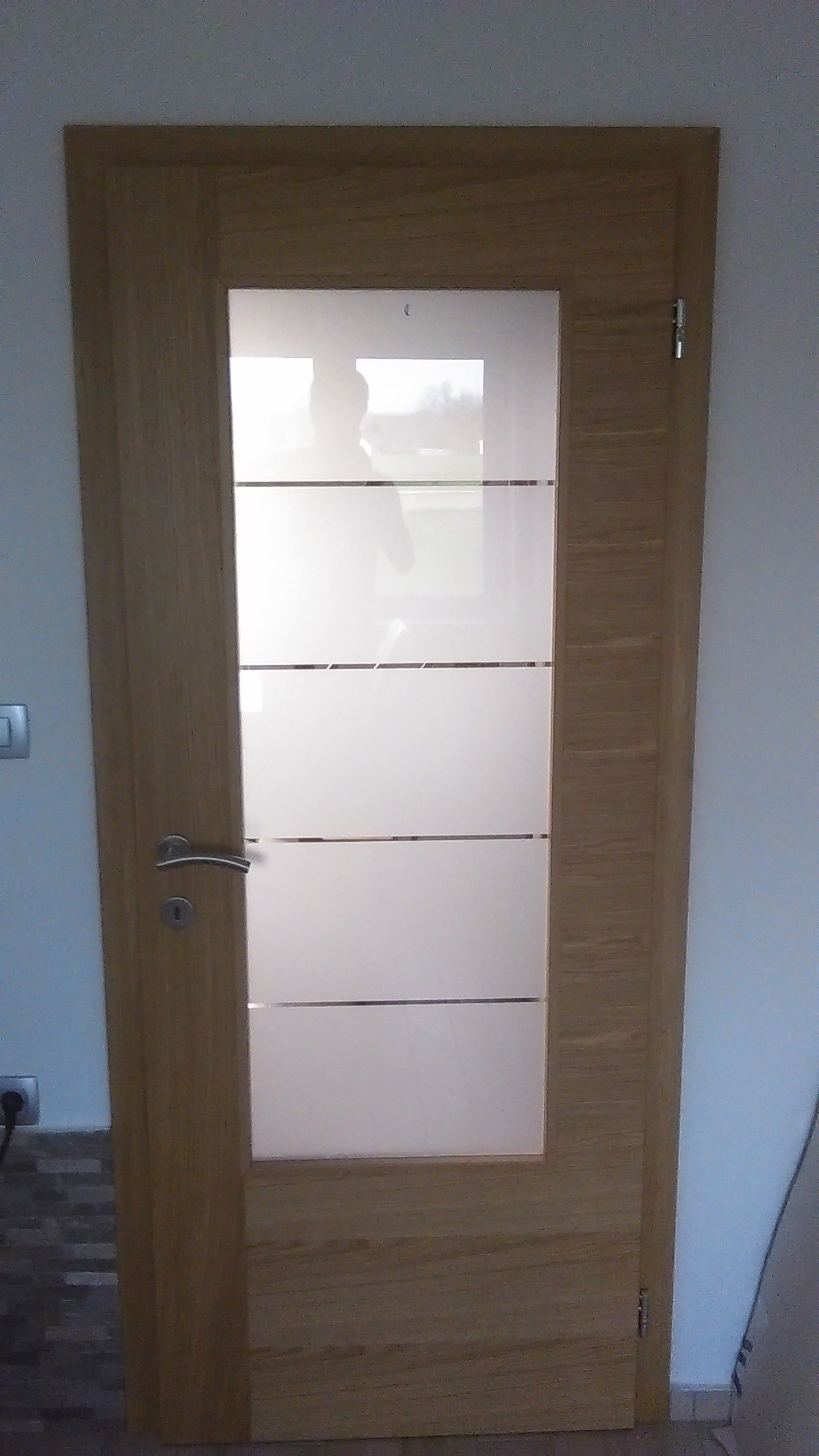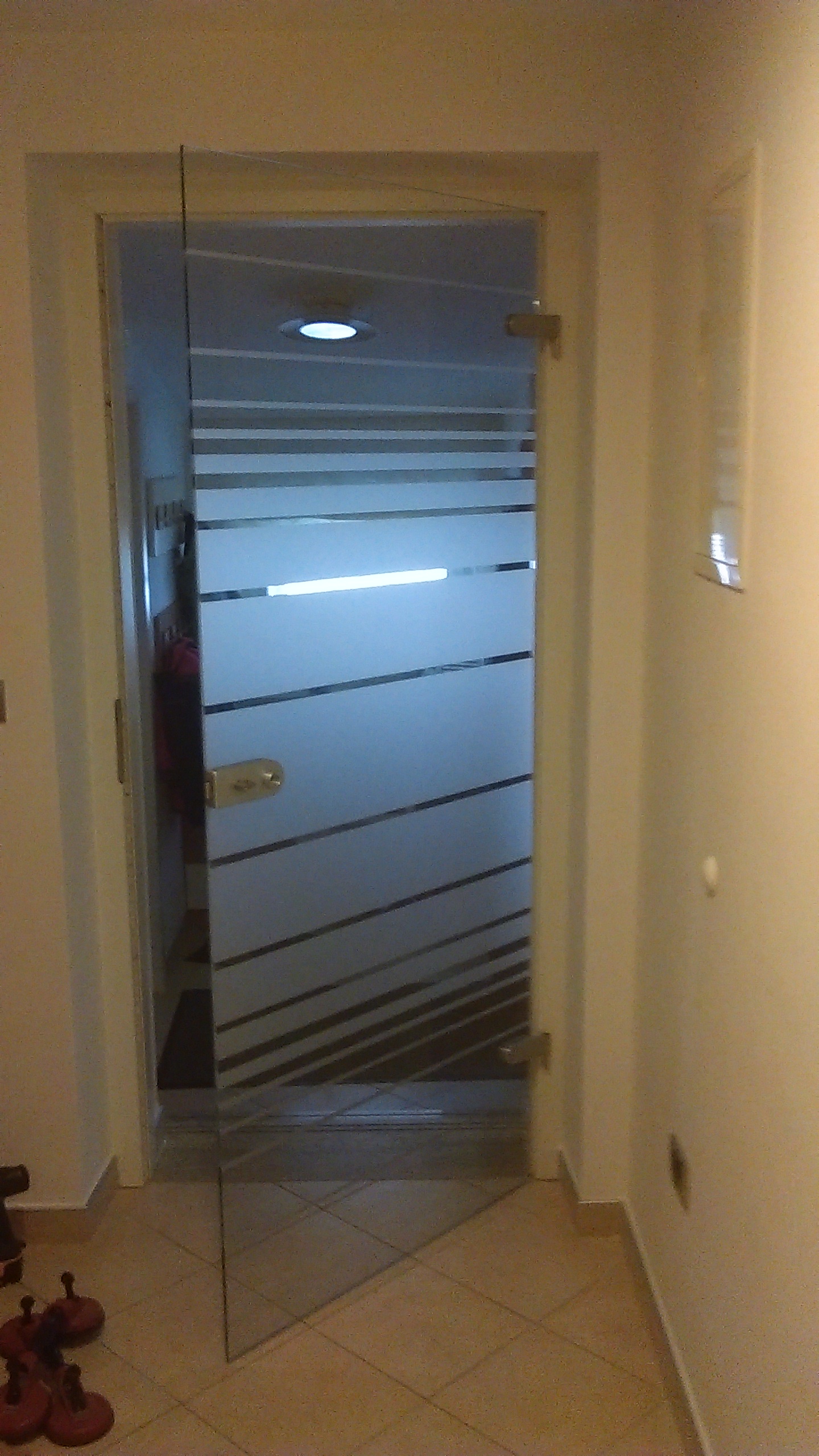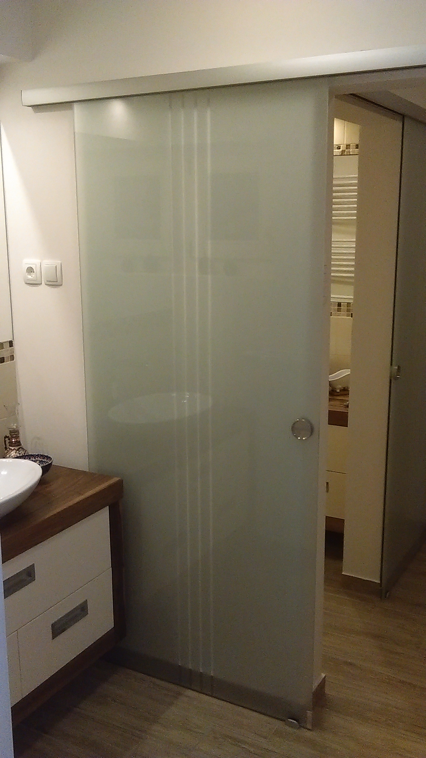 Steklena vrata Izdelujemo vrata vseh dimenzij iz kaljenega 8,8mm ali 10mm stekla. Lahko so prozorna, jedkana ali vzorčna iz fototapete.